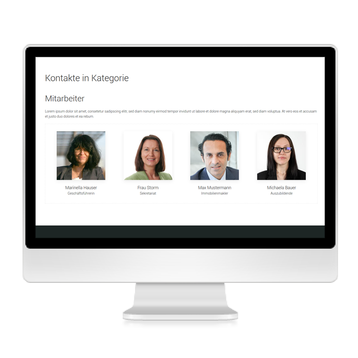 Mit der Kontakt Komponente können Sie Kontakte in verschiedenen Kategorien erstellen und bearbeiten. Die Kontakt Komponente ist damit die ideale Lösung zur pflege Ihrer Mitarbeiter und Firmenkontakte. Für jeden Kontakt kann ein individuelles Kontaktformular angezeigt werden.