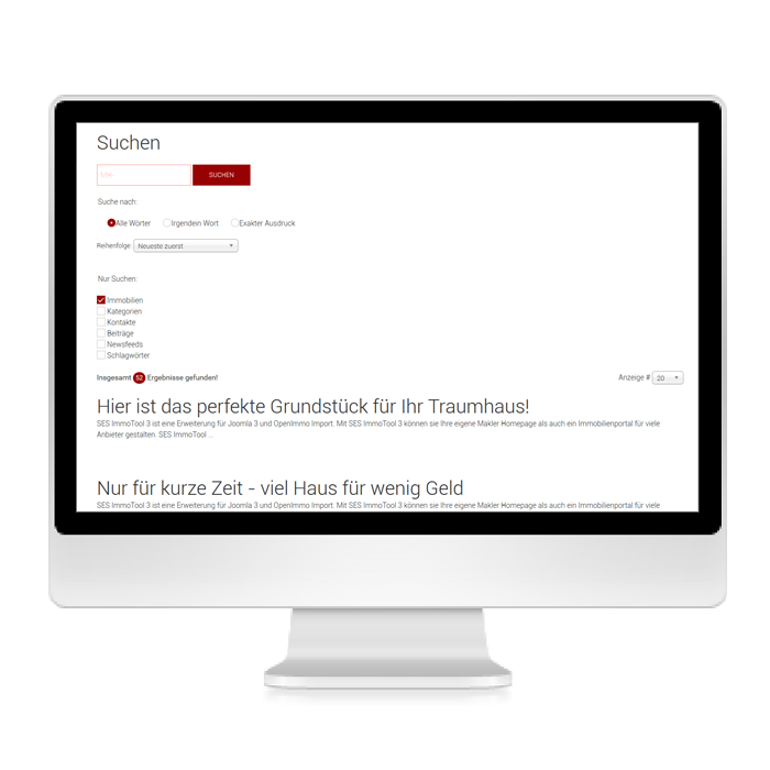 Das Plugin 'Suche - SES ImmoTool 3' erweitert die Joomla Suchfunktion um die Möglichkeit der Volltextsuche in den Immobilienangeboten. So können Sie zum Beispiel nach Objeknummern, Angebotstiteln oder Orten suchen.