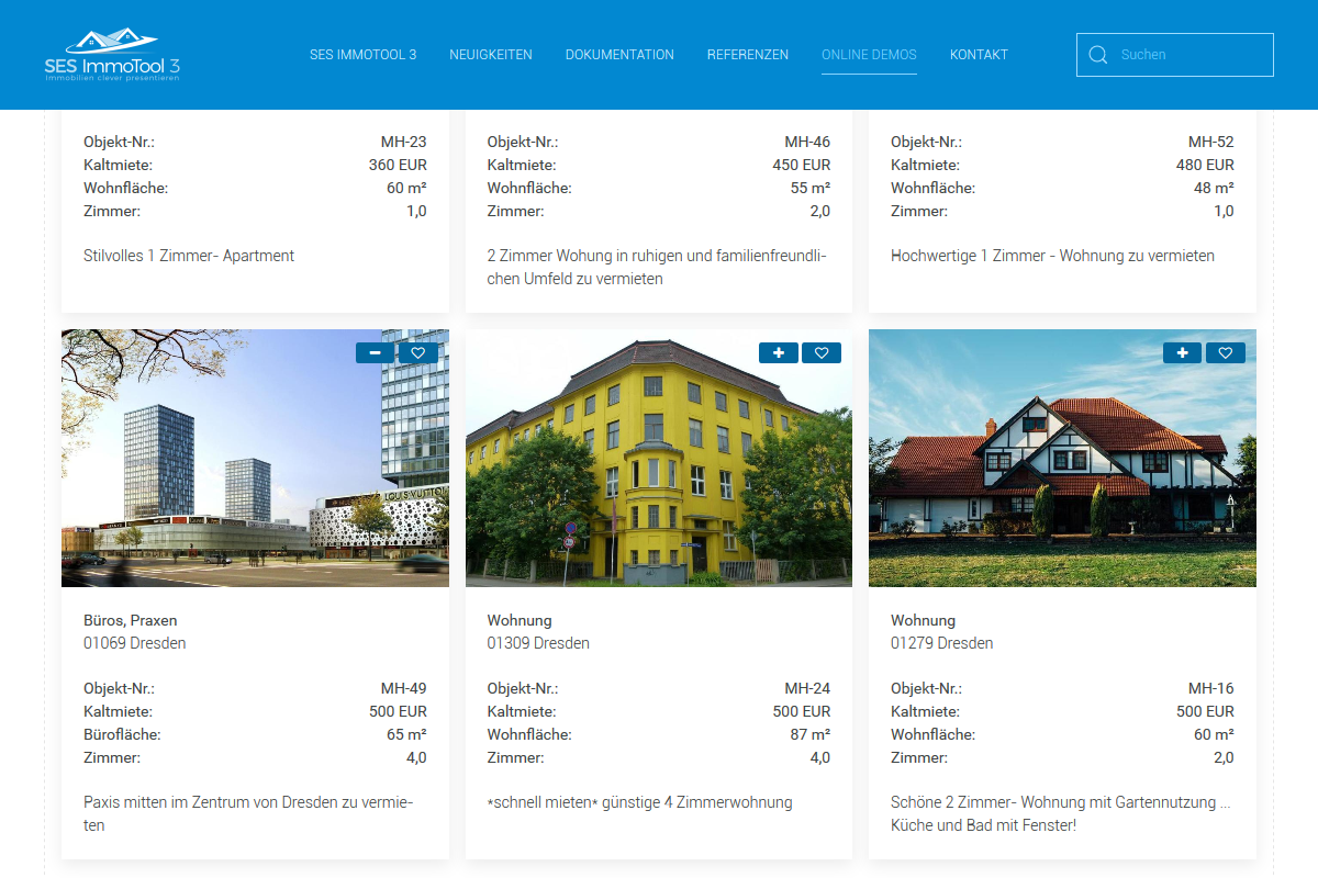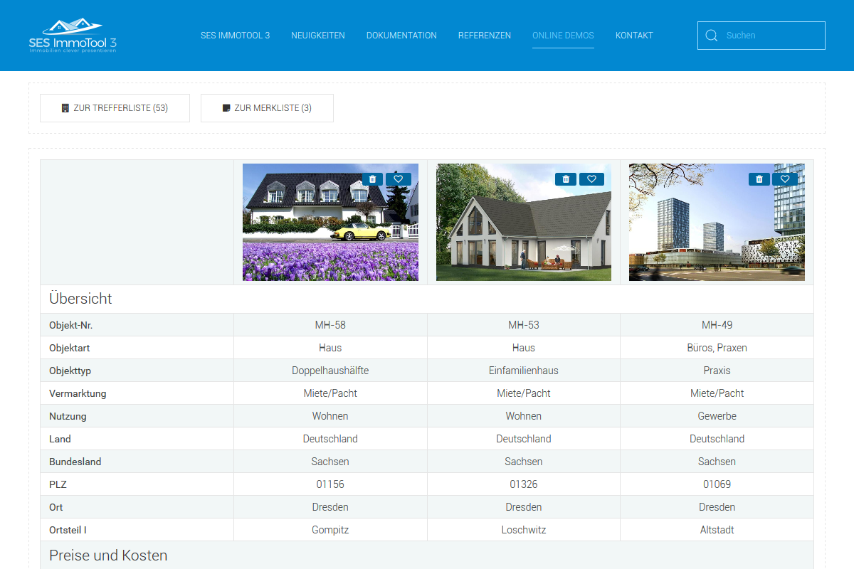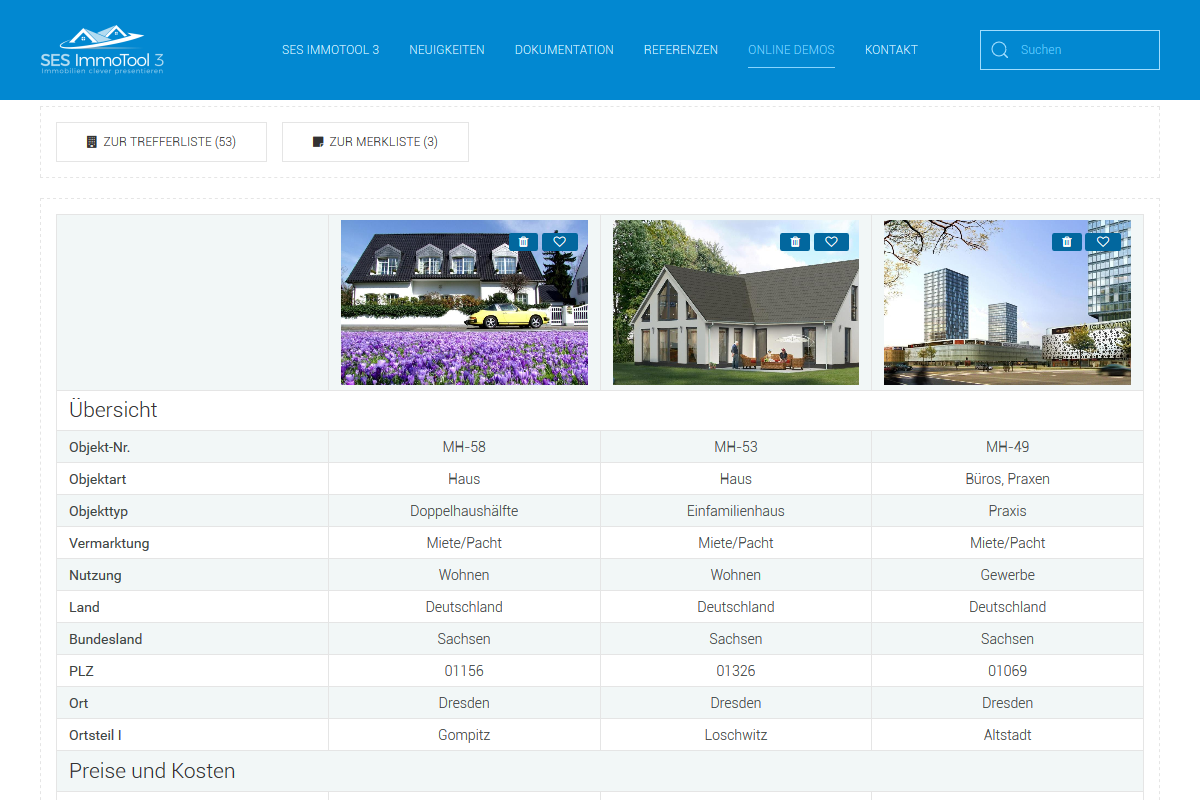 Benutzer können in der Trefferliste, Merkliste und in entsprechenden Modulen über die + / - Symbole Immobilien zum Vergleich auswählen. Der Button "zur Vergleichliste" wird in den ensprechenden Ansichten angezeigt.